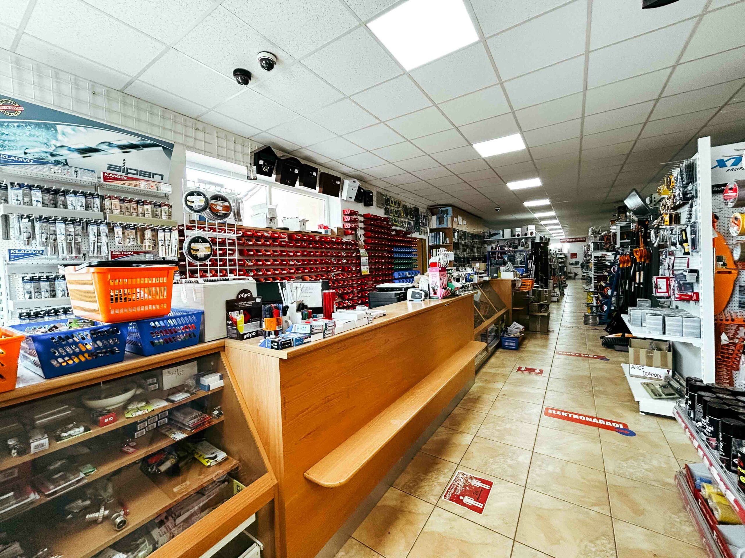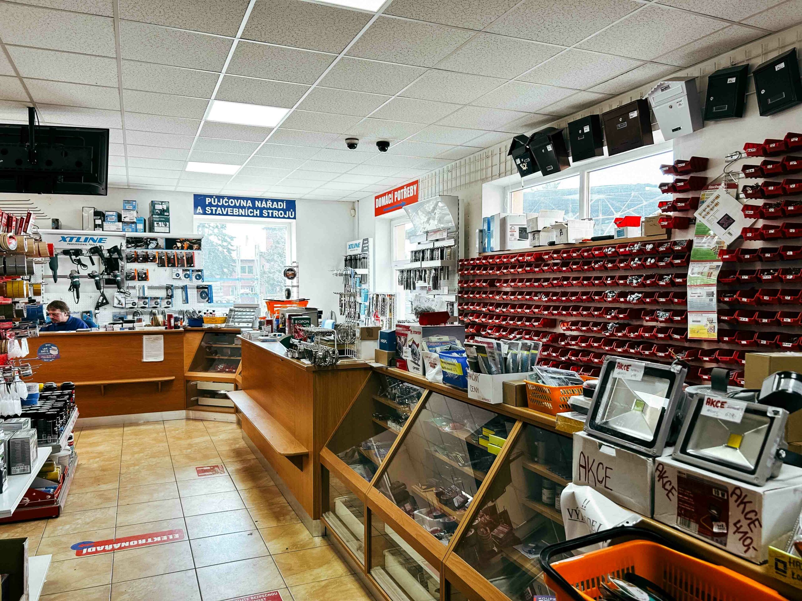 Spojovací materiál, hřebíky, šrouby, panty, kování, ruční i elektrické nářadí.