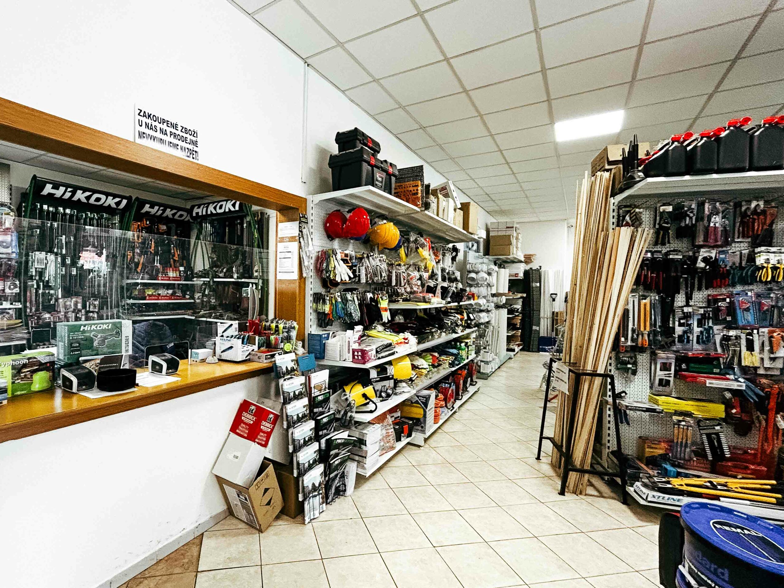 Spojovací materiál, hřebíky, šrouby, panty, kování, ruční i elektrické nářadí.